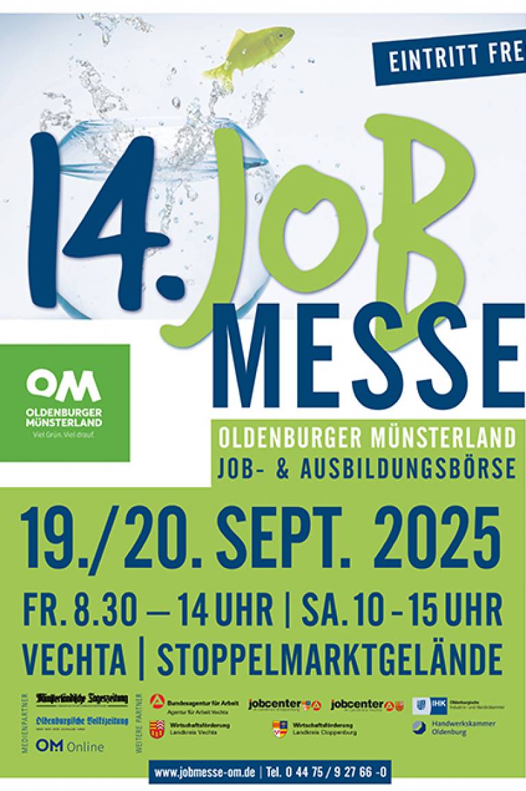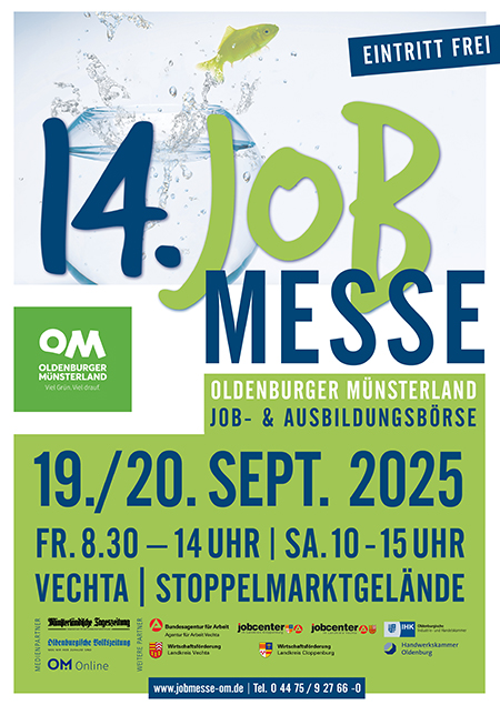 Du machst Dir Gedanken über Deine berufliche Zukunft, weißt aber noch nicht genau, wohin die Reise gehen soll? Dann könnte die 14. Job- und Ausbildungsmesse Oldenburger Münsterland am Freitag, 19. und Samstag, 20. September 2025 in Vechta auf dem Stoppelmarktgelände genau das Richtige für Dich sein.