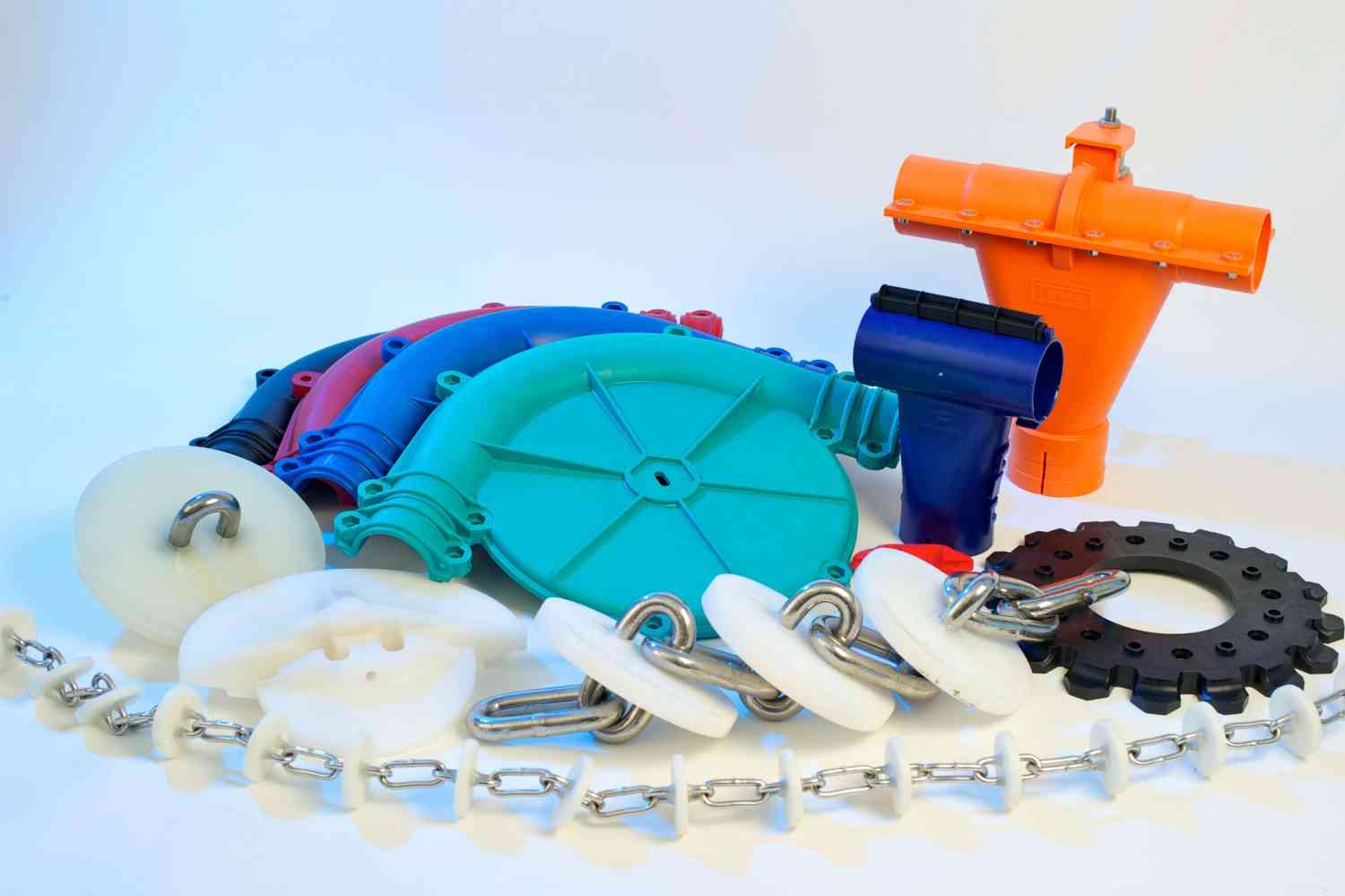 With our ECO-CHAIN² program, we also offer conveyor chains in this area that are already overmoulded with regenerated plastic material and are used for transporting solid media. Please feel free to contact us. We'll find a solution together.